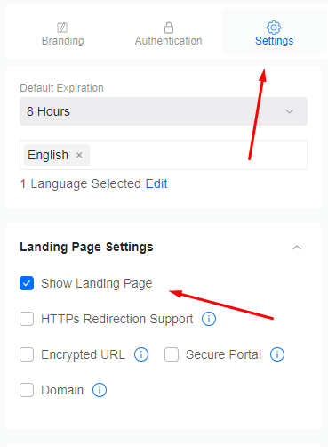 Procure a aba “Settings” marque a opção “Show Landing Page”