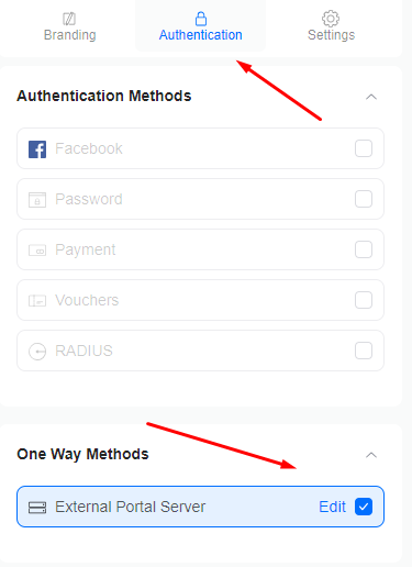 Procure a aba “Authentication” e em “One Way Method” selecione “External Portal Server” e inclua 152.70.220.32 (Proxy)