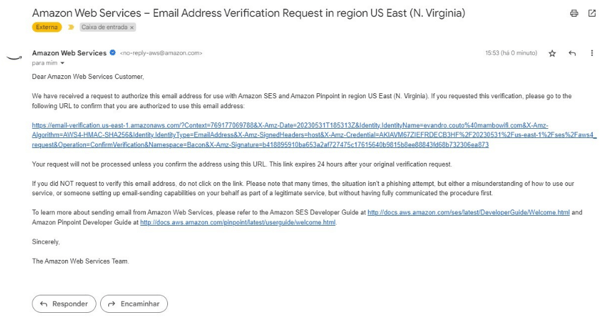 Após a inclusão do e-mail foi adicionado, informaremos ao cliente sobre a conclusão da solicitação e envio do e-mail personalizado da AWS para que a validação seja realizada, por via do seguinte e-mail: