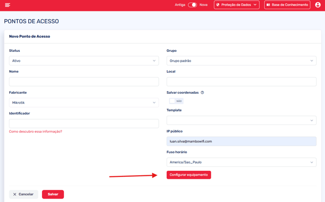 Acesse o painel administrativo do seu Mambo Wifi, no menu clique em Pontos de Acesso > Pontos de Acesso (novamente) > Clique em Cadastrar Ponto de Acesso.